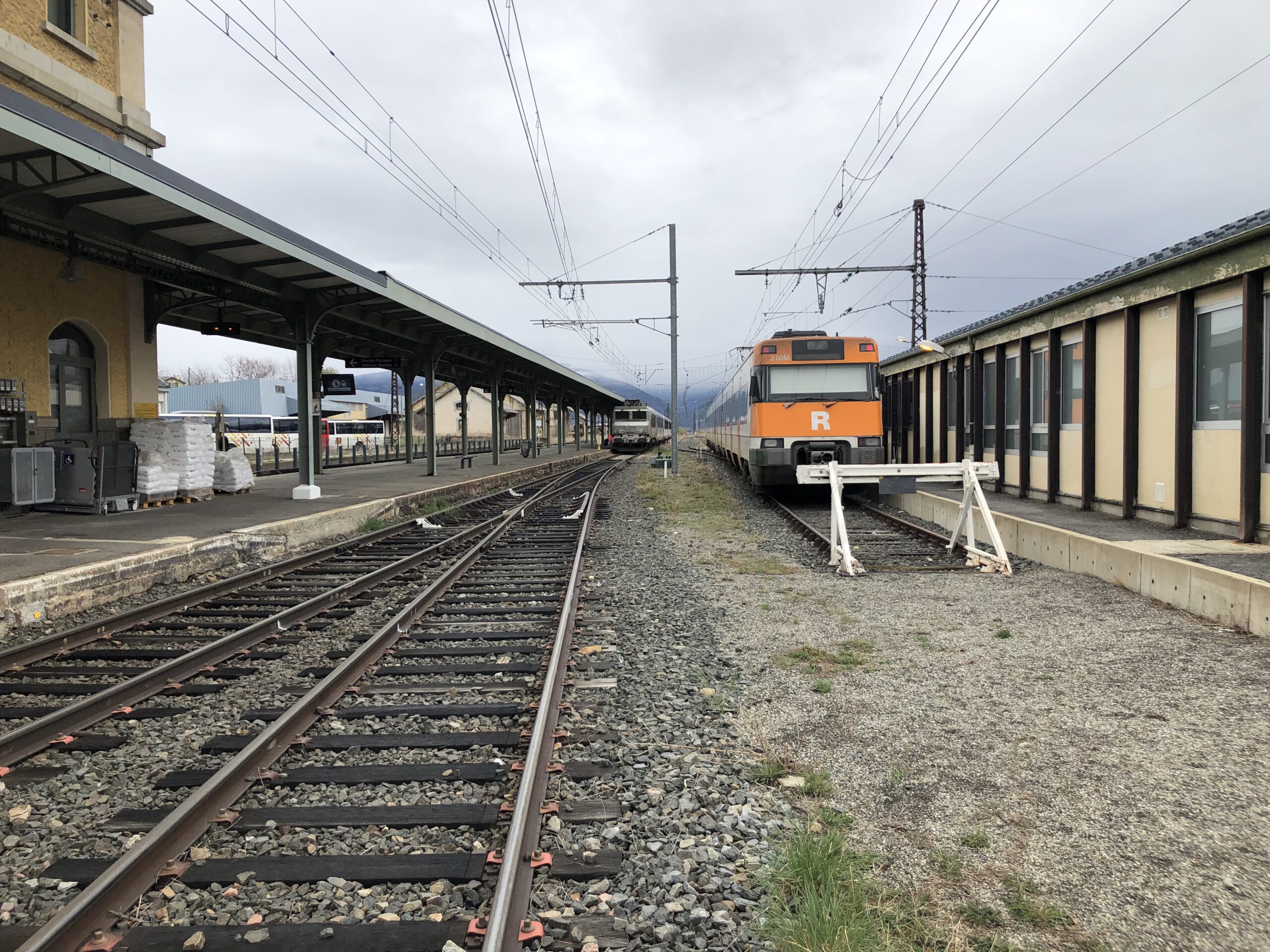 Grenzbahnhof Latour de Carol, links im Bild der Nachtzug aus Paris, rechts die Regionalbahn nach Barcelona auf iberischer Breitspur